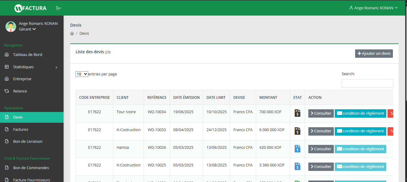 Notre application web vous permet de réaliser vos devis, facture, bon de commande, bon de livraison en quelques cliques.